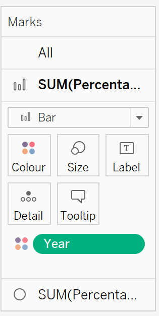 For all charts, drag [Year] to Color under the Marks Card and select diverging color palette to identify respective years.