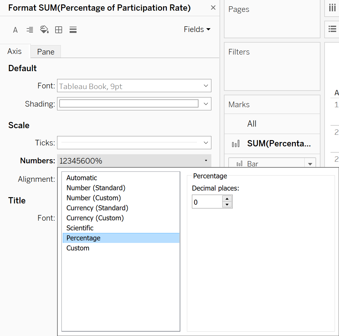 Format horizontal axis’s scale to Percentage with 0 decimal place and select Synchronise Axis. Right click on the axis and untick Show Header.