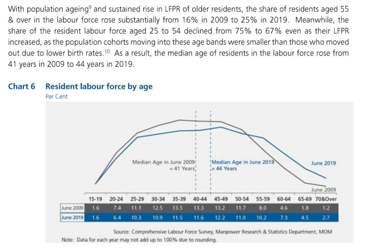 The resident labour force continued to age. With the population ageing and increased in labour force participation rate among older residents, the median age of the resident labour force rose from 41 years in 2009 to 44 years in 2019.