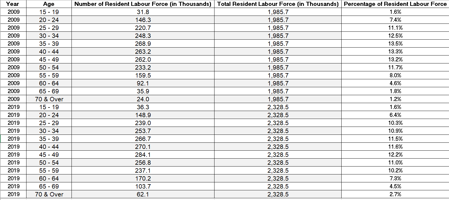 Evident from Figure 3: Resident Labour Force in Percentage for Age Groups 15-24,25-54 and 55&over, one in four (25%) residents in the labour force in 2019 were aged 55 and above, up from 16% in 2009. In constrast, the proportion of residents aged 15-24 decline from 9% in 2009 to 8% in 2019 and those residents aged 25-54 from 75% in 2009 to 67% in 2019.