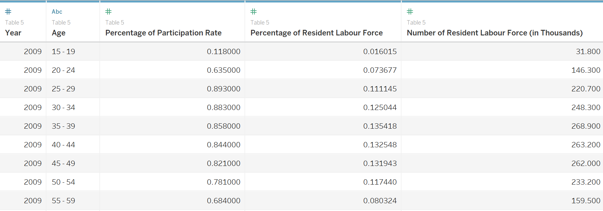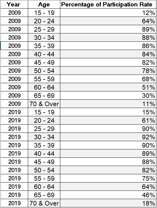 Table 5: Resident Labour Force Participation Rate by Age and Sex, 2009-2019 (June)