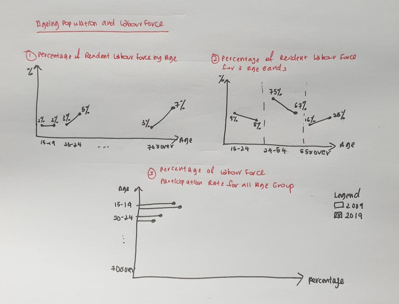 In order to clearly compare the changes of Labour Force Participation Rate and Resident Labour Force for 2-year period across all age groups, 3 individual charts are proposed instead of 1 chart as shown in the initial visualization.