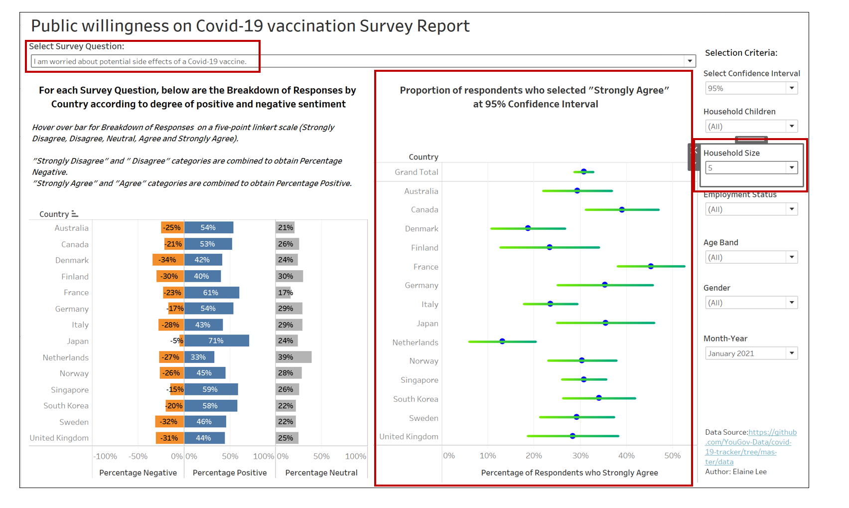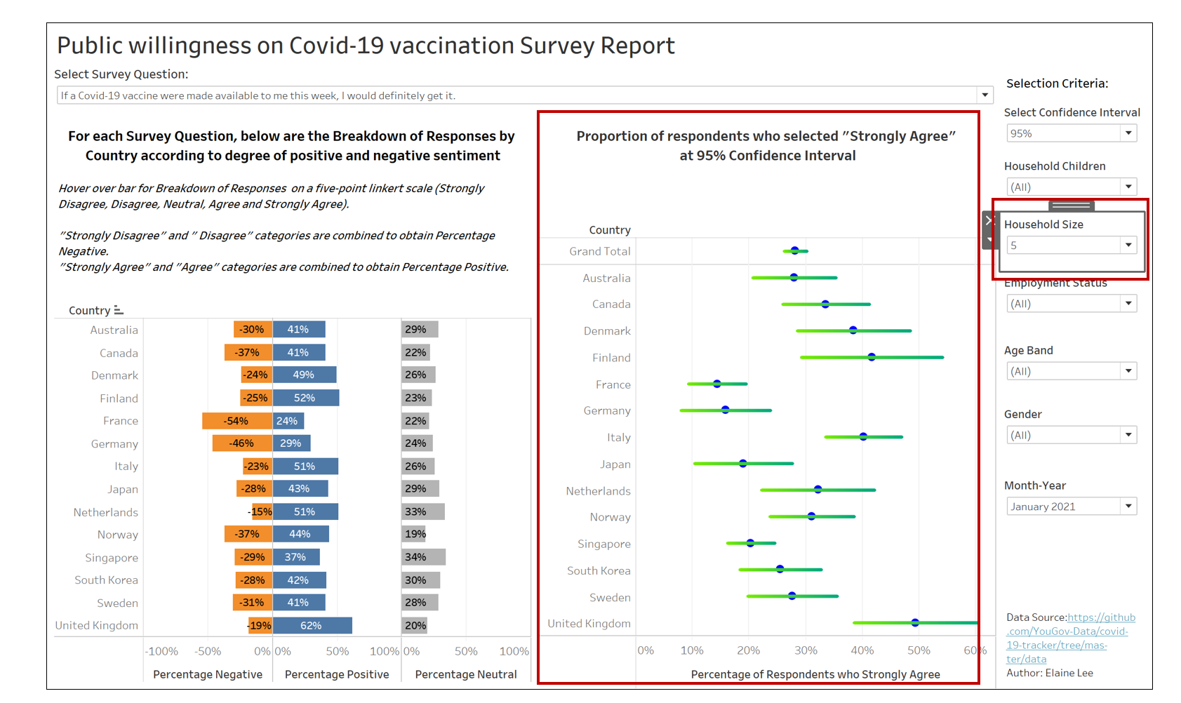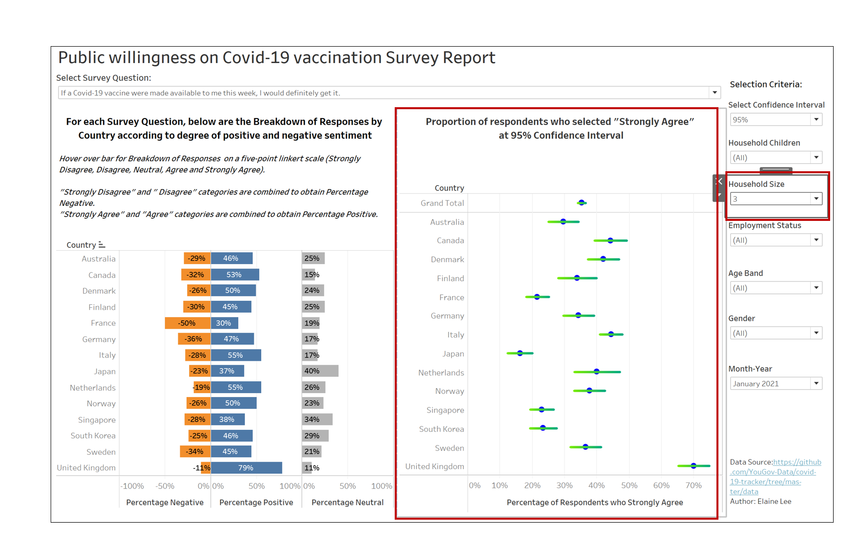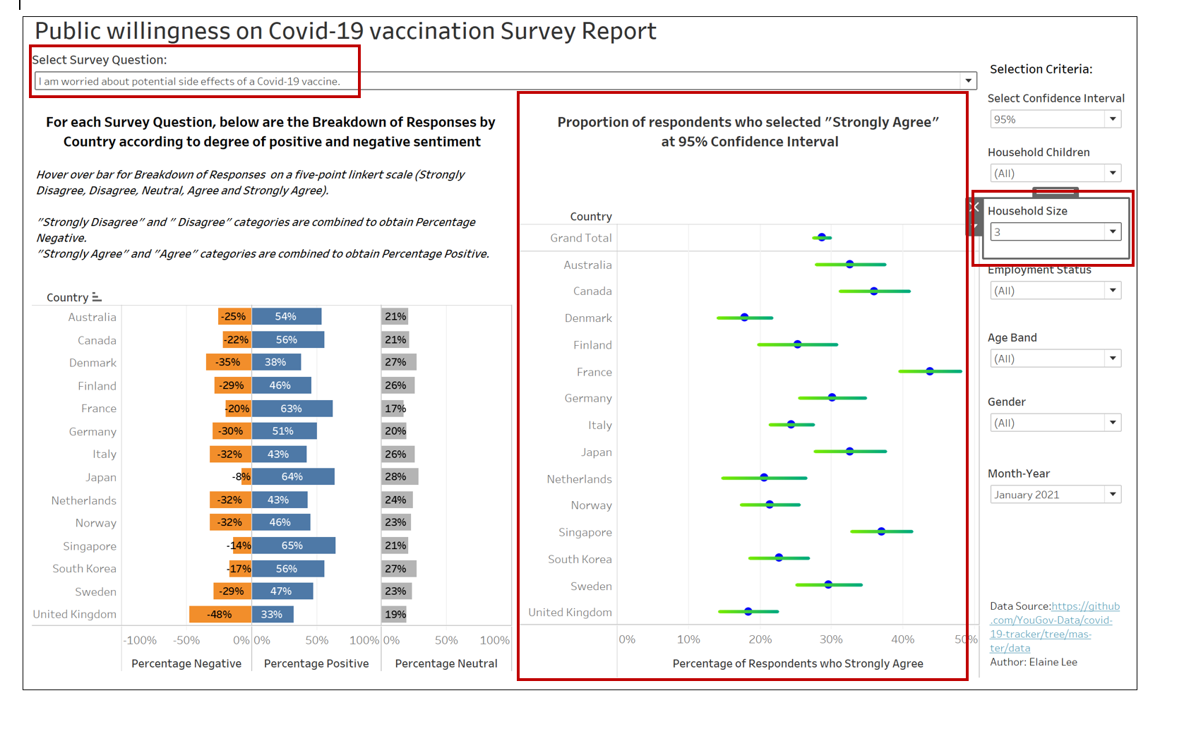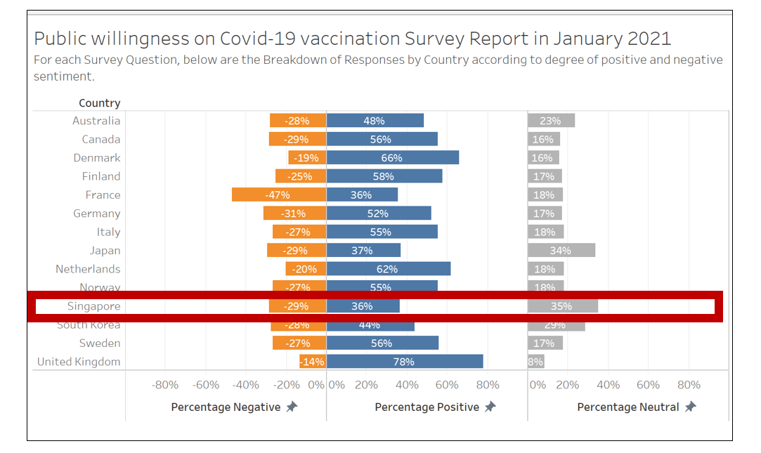 The bar chart indicating “% of strongly agreed to vaccination” shows the breakdown of the percentage of strongly agreed to vaccination for respective countries but does not reflect the number of respondents. Hence, it may mislead user to the wrong conclusion if the sample size is small.