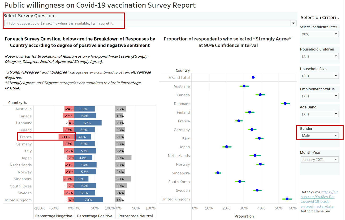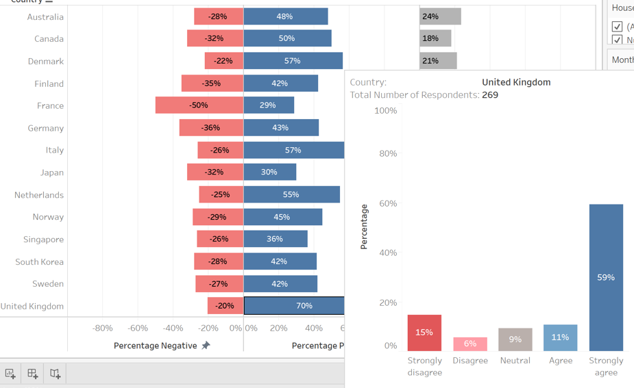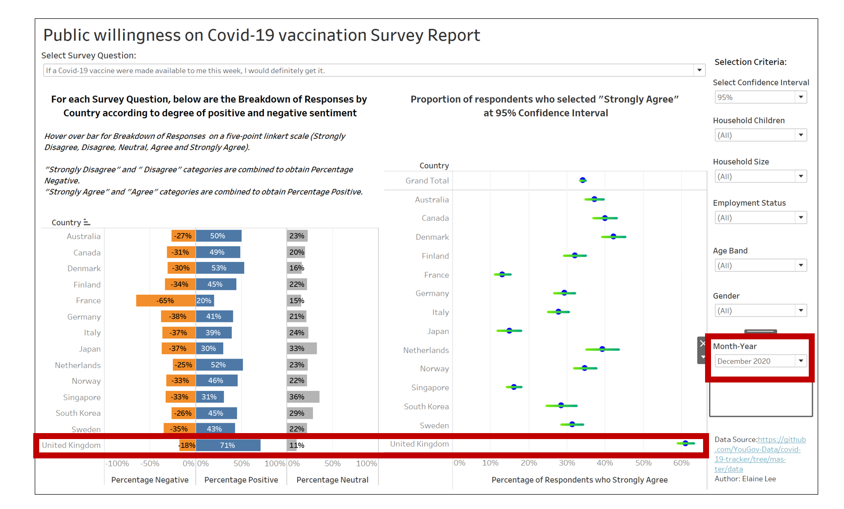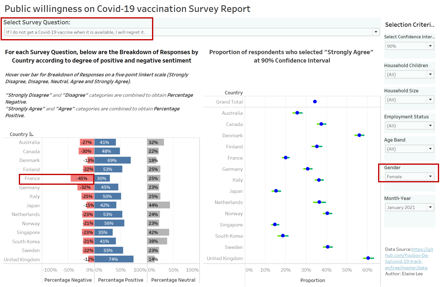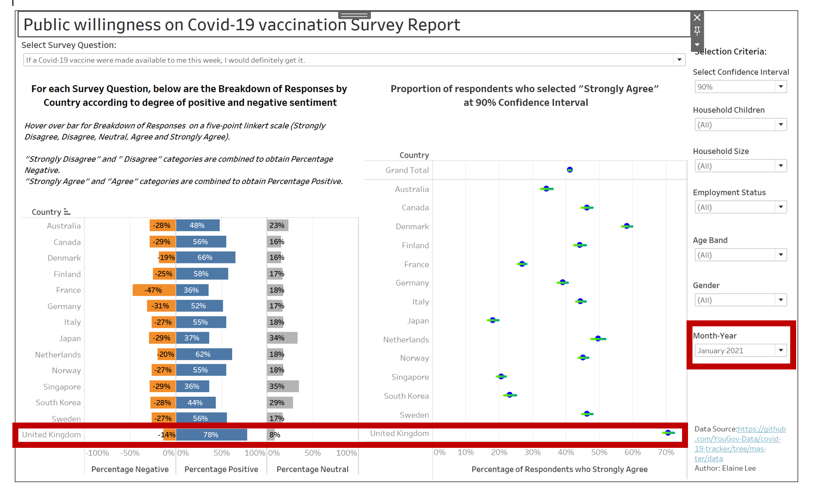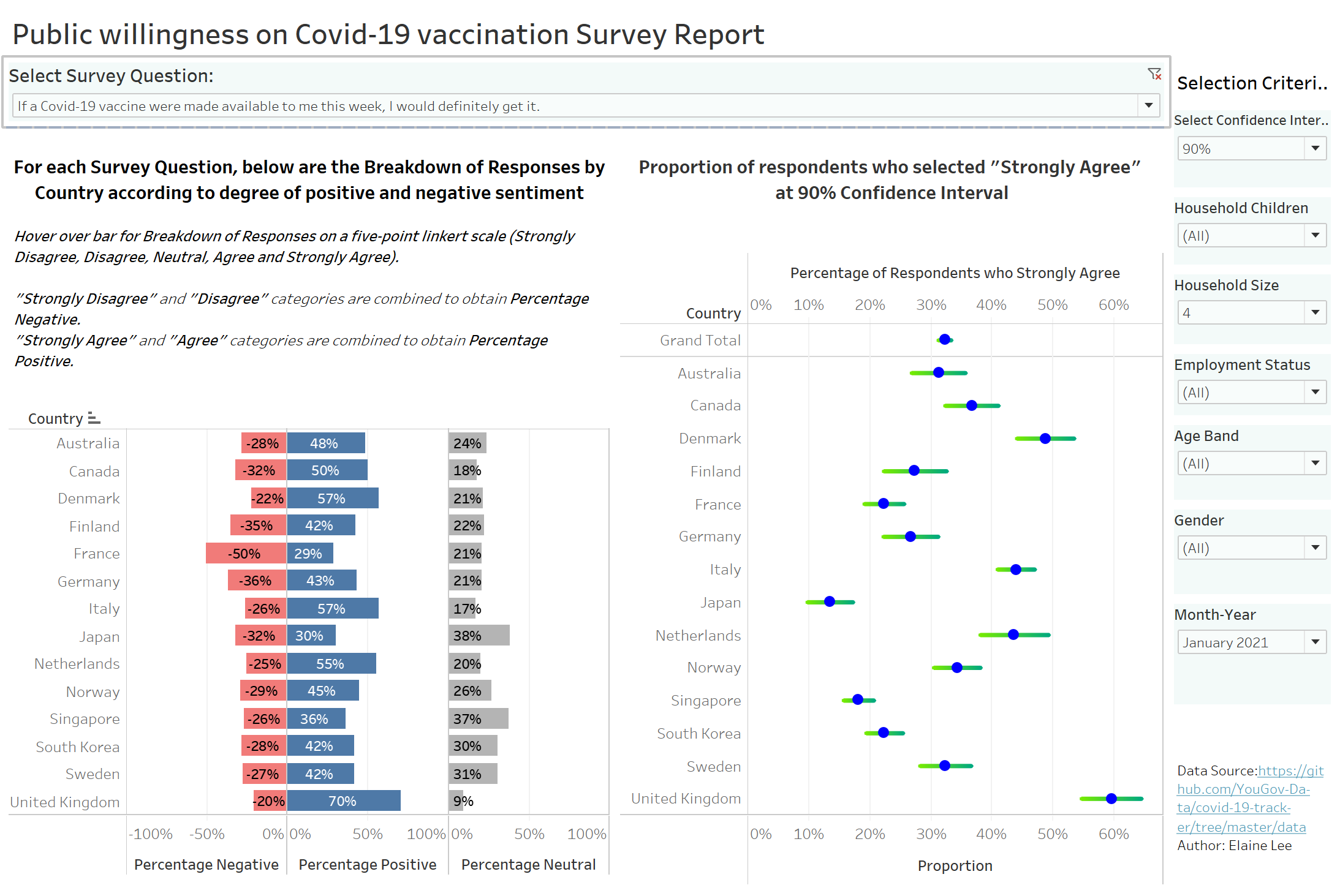 The bar chart indicating “% of strongly agreed to vaccination” shows the breakdown of the percentage of strongly agreed to vaccination for respective countries but does not reflect the number of respondents. Hence, it may mislead user to the wrong conclusion if the sample size is small.