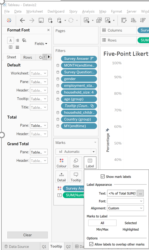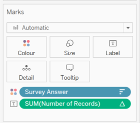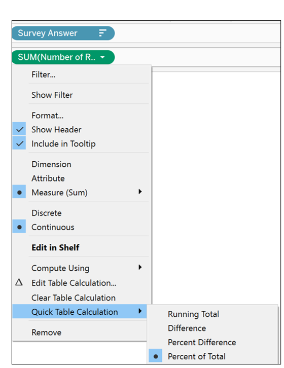 Drag [Survey Answer] to the Columns shelf and [Number of Records] to the Rows shelf. Right-click on [Number of Records] and select Percent of Total under Quick Table Calculation.