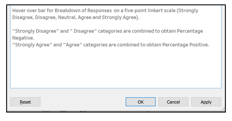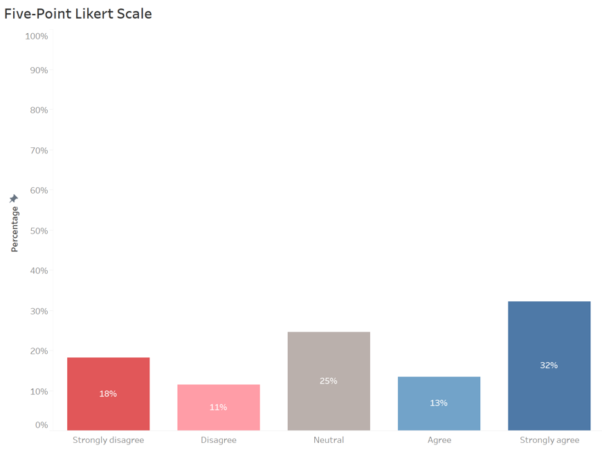 Subsequently, a histogram bar chart is created to show the breakdown of responses for all point values on a Likert scale (“1-Strongly agree”, “2-Agree”,“3-Neutral”,“4-Disagree”,“5-Strongly disagree”) when user hovers over the stacked bar.