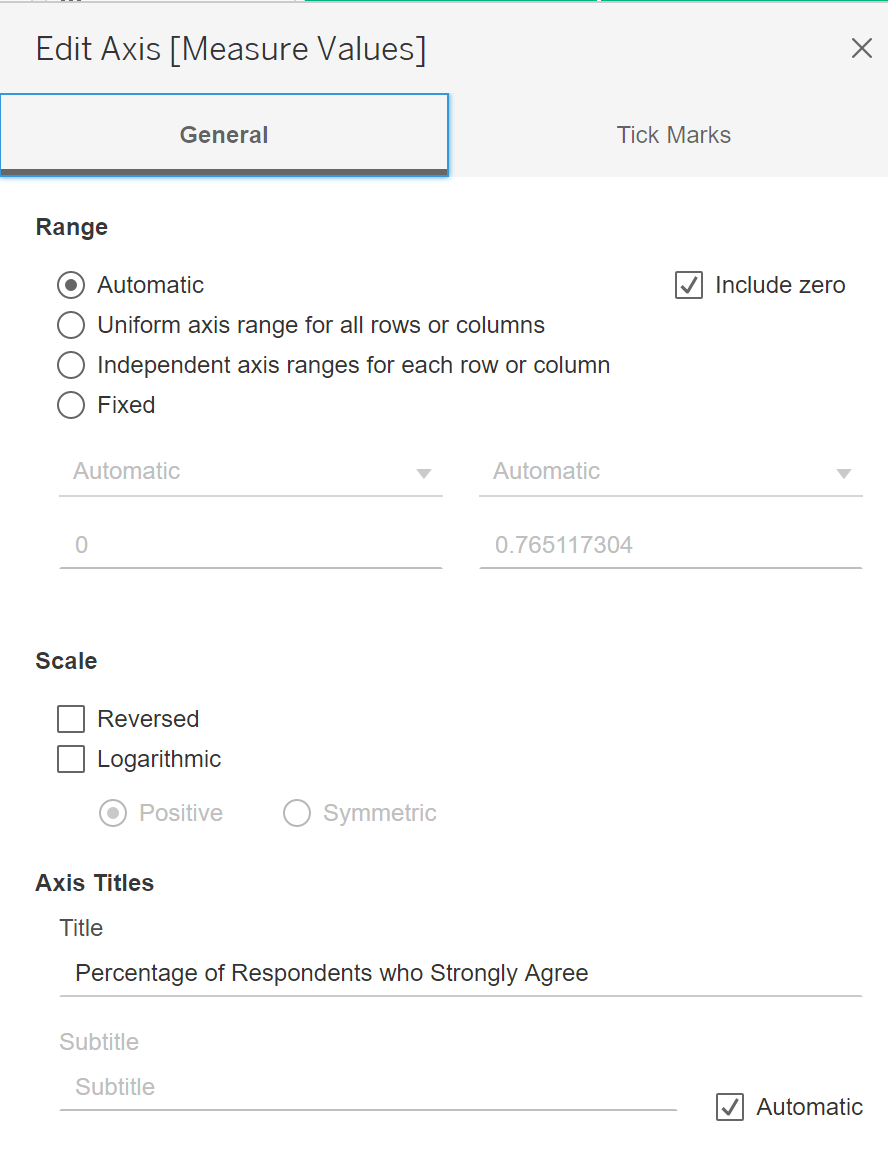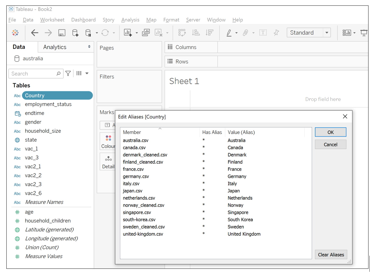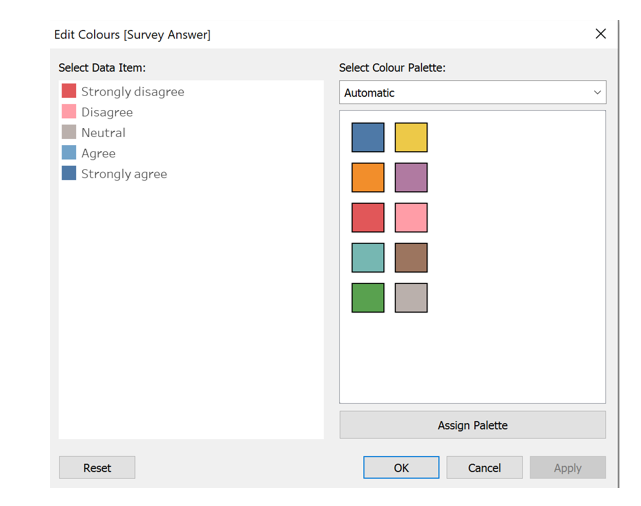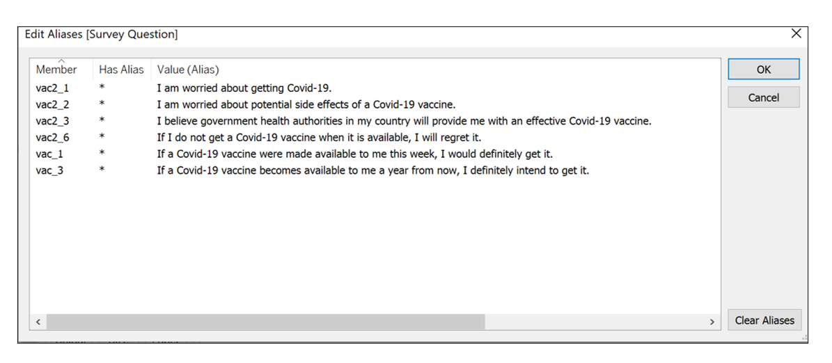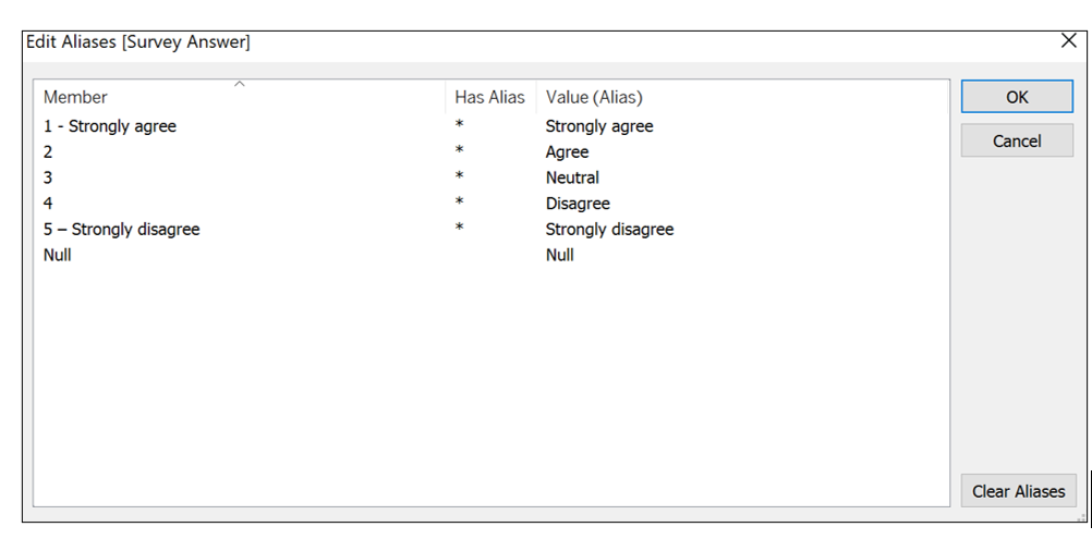 In the Data pane, right-click on “Survey Question” and select Aliases. In the Edit Aliases dialog box, amend the Value (Alias) to the following responses ranges.