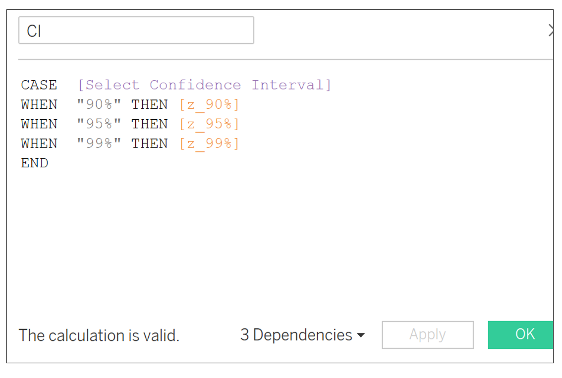 Create calculated field – Z Value for 95% confidence interval: Create the calculated field “Z_95%” with value as follows: 1.959964