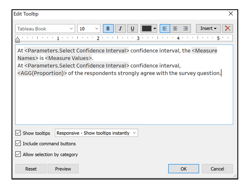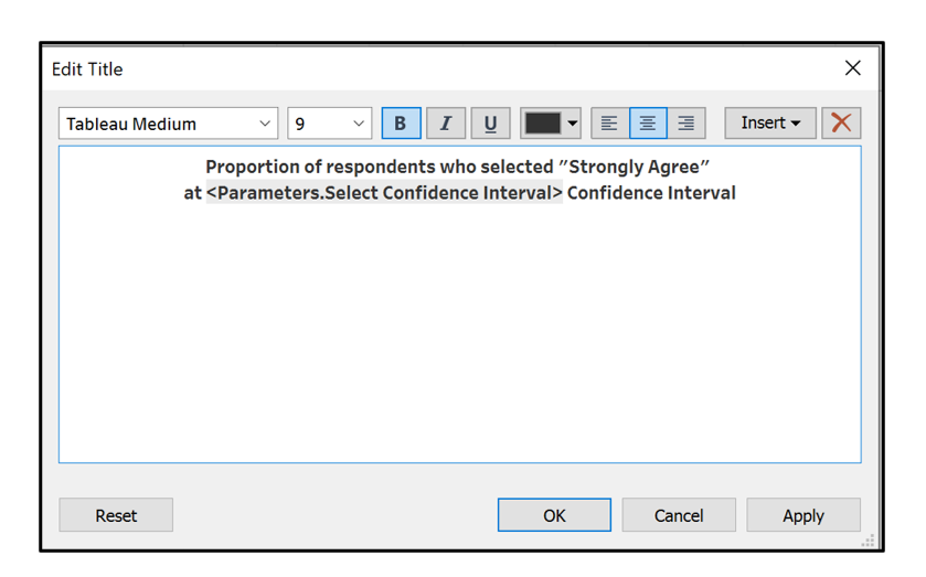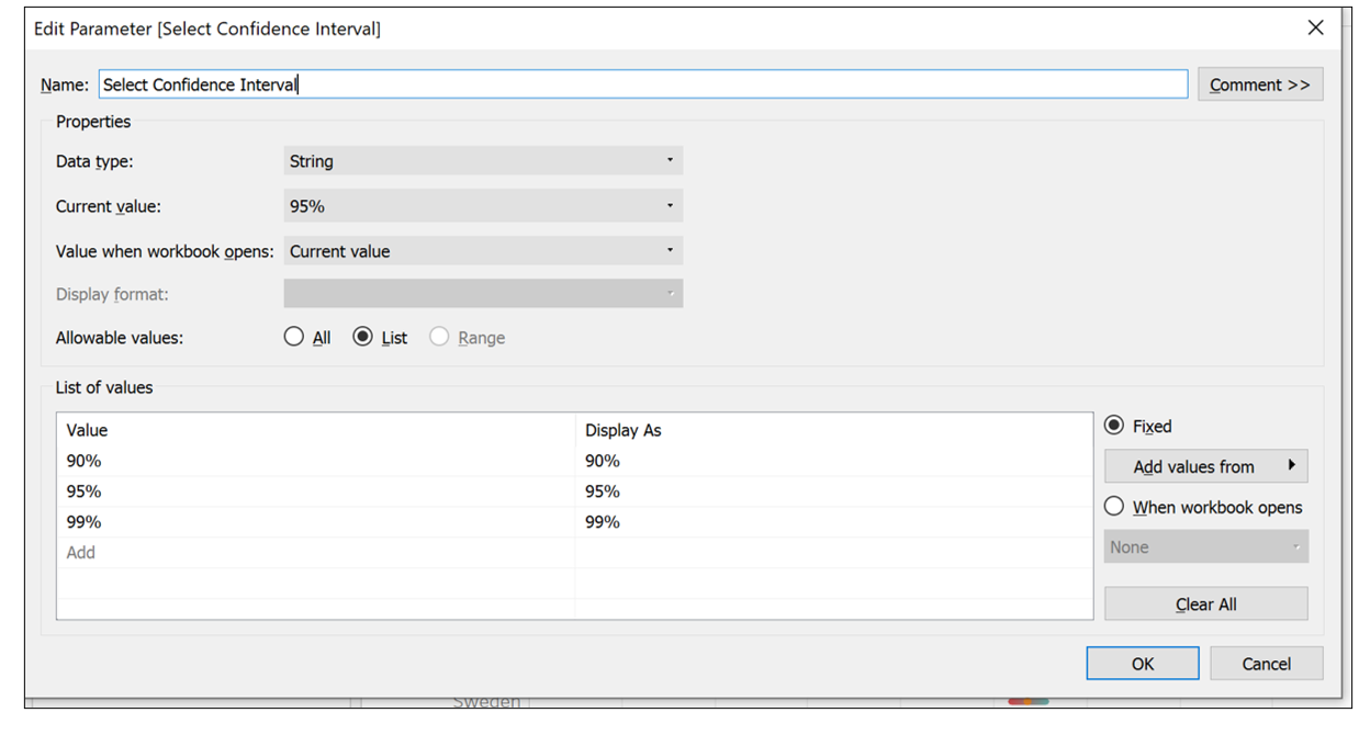 Create a parameter to select confidence interval: In the Data pane, click the drop-down arrow in the upper right corner and select Create Parameter. Select the Data type as “String” and Allowable values as “List”. Edit the List of Values as follows: