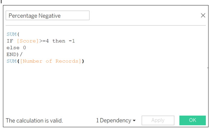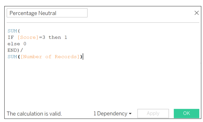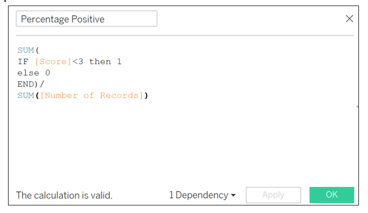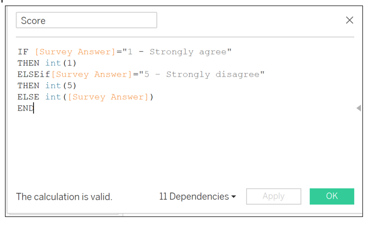 Create calculated field – Score-Strongly Agree: To extract the percentage of survey responses who strongly agreed to vaccination, create the calculated field “Score-Strongly Agree” with calculation as follows: