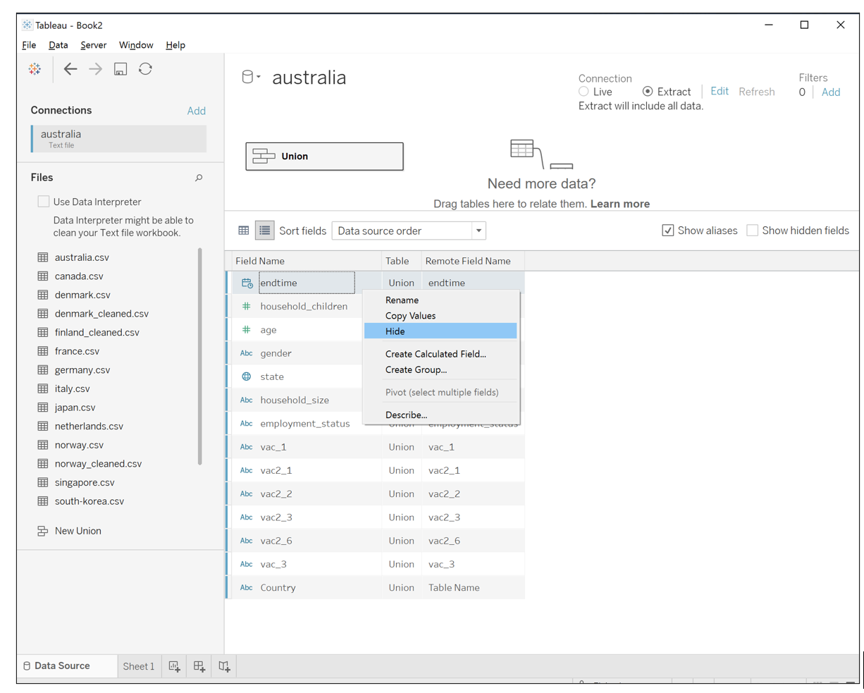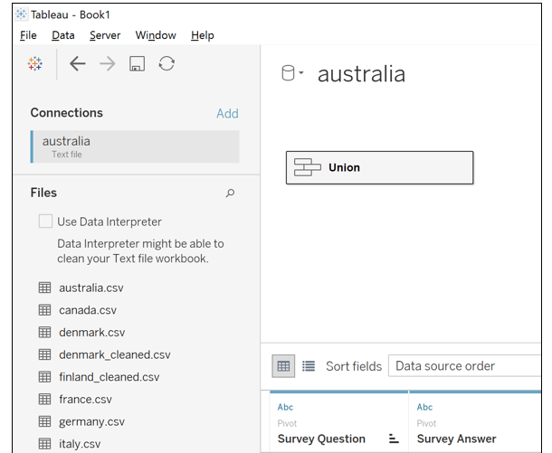 Unzip the zip files of Australia, Denmark, France, Germany, Italy, Norway, Singapore, Sweden and United Kingdom which was downloaded from Imperial College London YouGov Covid 19 Behaviour Tracker Data Hub hosted at Github. Save all 14 CSV files (comprised of Australia, Canada, Denmark, Finland, France, Germany, Italy, Japan, Netherlands, Norway, Singapore, South Korea, Sweden and United Kingdom) in a folder.
