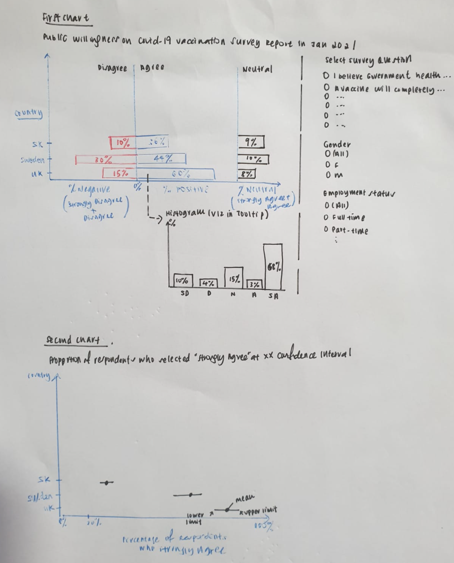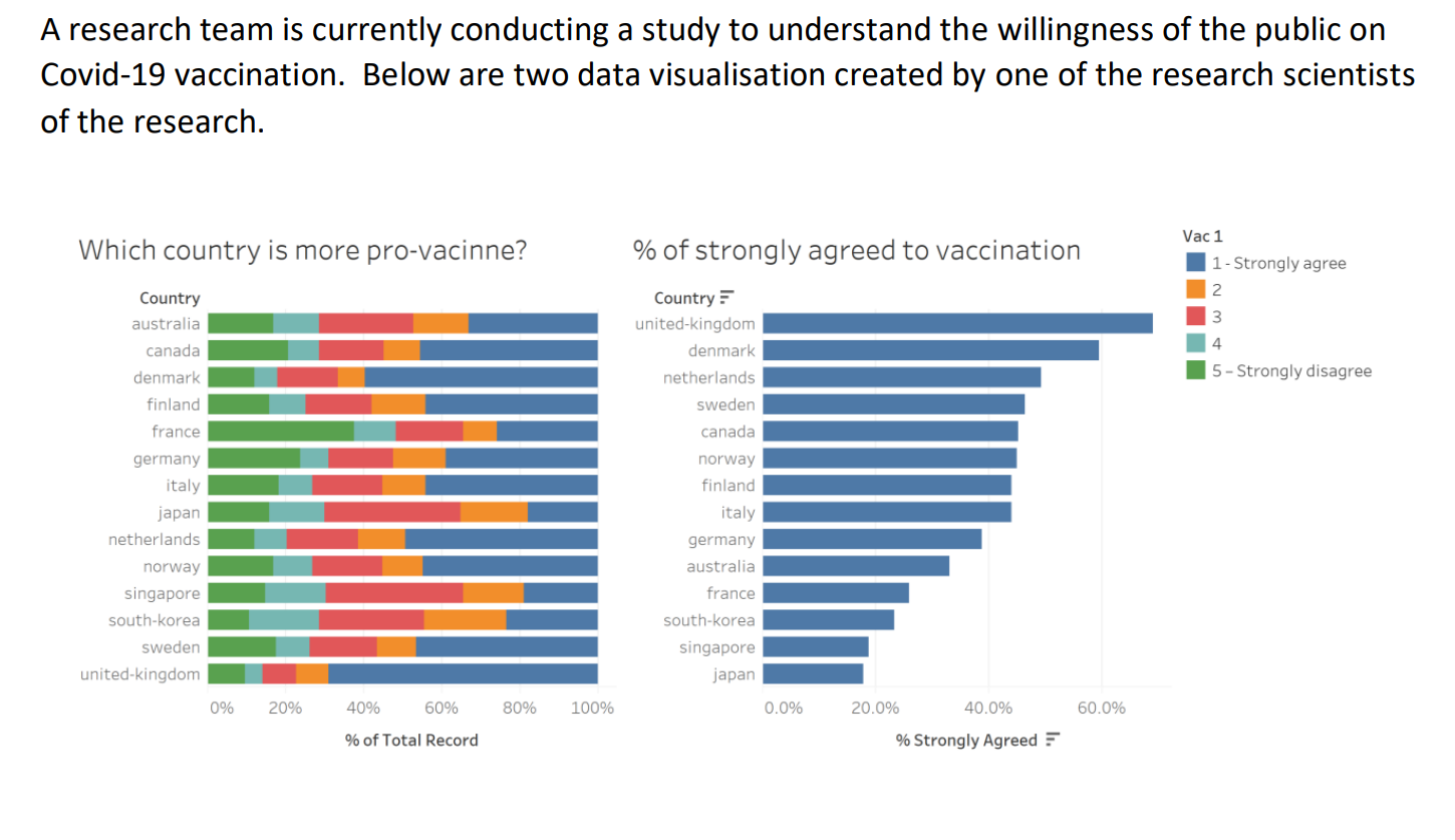There is inconsistent sort method associated with each chart. For the stacked bar chart indicating “Which Country is more pro-vaccine?”, the country is sorted in ascending alphabetical for the Y-axis while the other bar chart indicating “% of strongly agreed to vaccination”, data is sorted by percentage of strongly agree for the Y-axis in descending order. Hence, it may mislead user that both charts are sorted in the same manner and hinder the proper interpretation of data.
