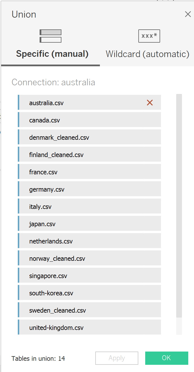 Next, manually union distinct tables. On the Data Source page, double click on New Union to set up the union. Select all tables to union in the left pane and then drag them directly below the first table.