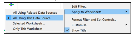 Select every filter on the right pane and click on the left arrow indicating “More Options”. Select “Apply to Worksheets” and click on “All Using This Data Source”.