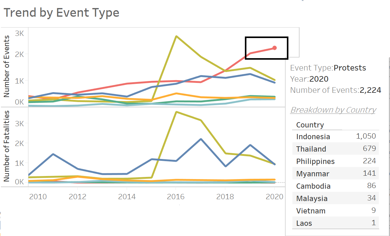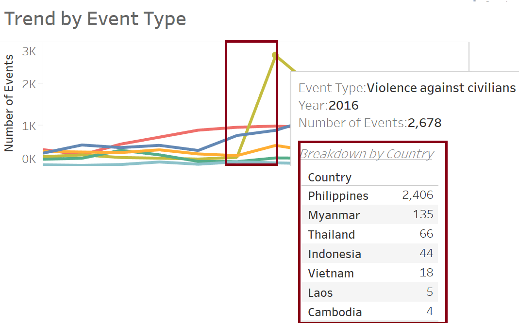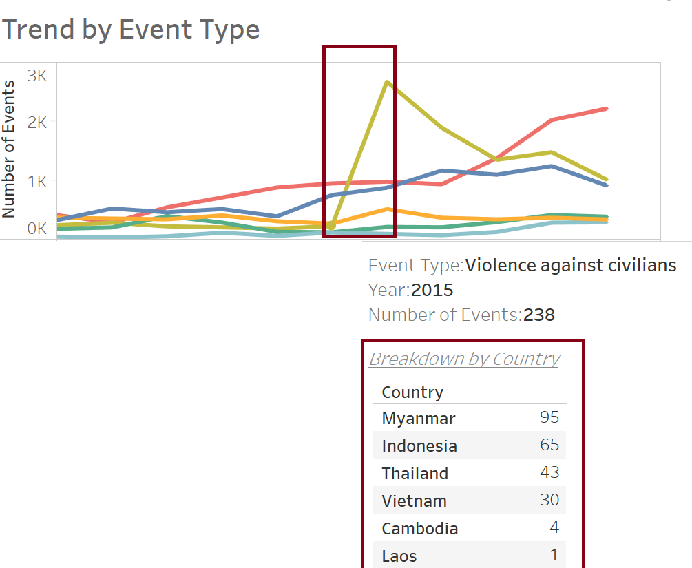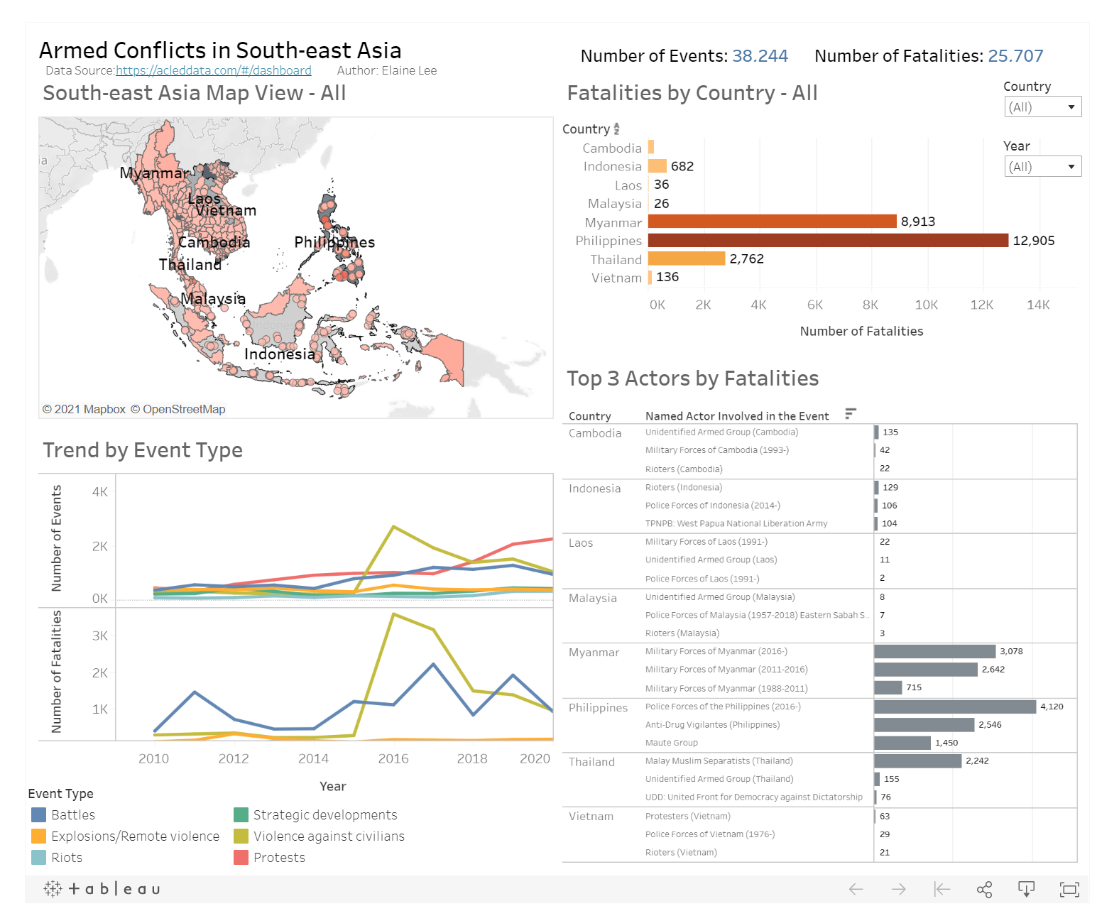 In order to build a dashboard that is interactive, parameter actions such as filters are used. For instance, user can visualize the number of events occurring in a country using a parameter control to change the year in which the event took place.