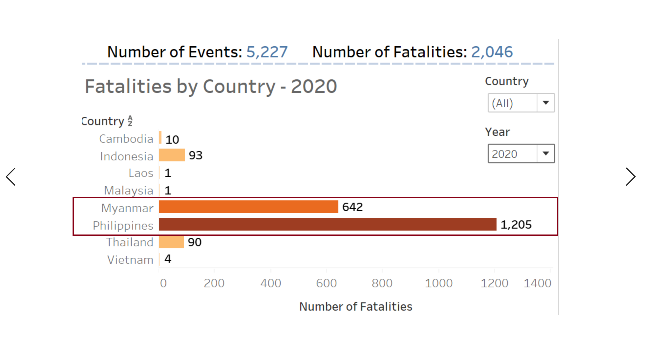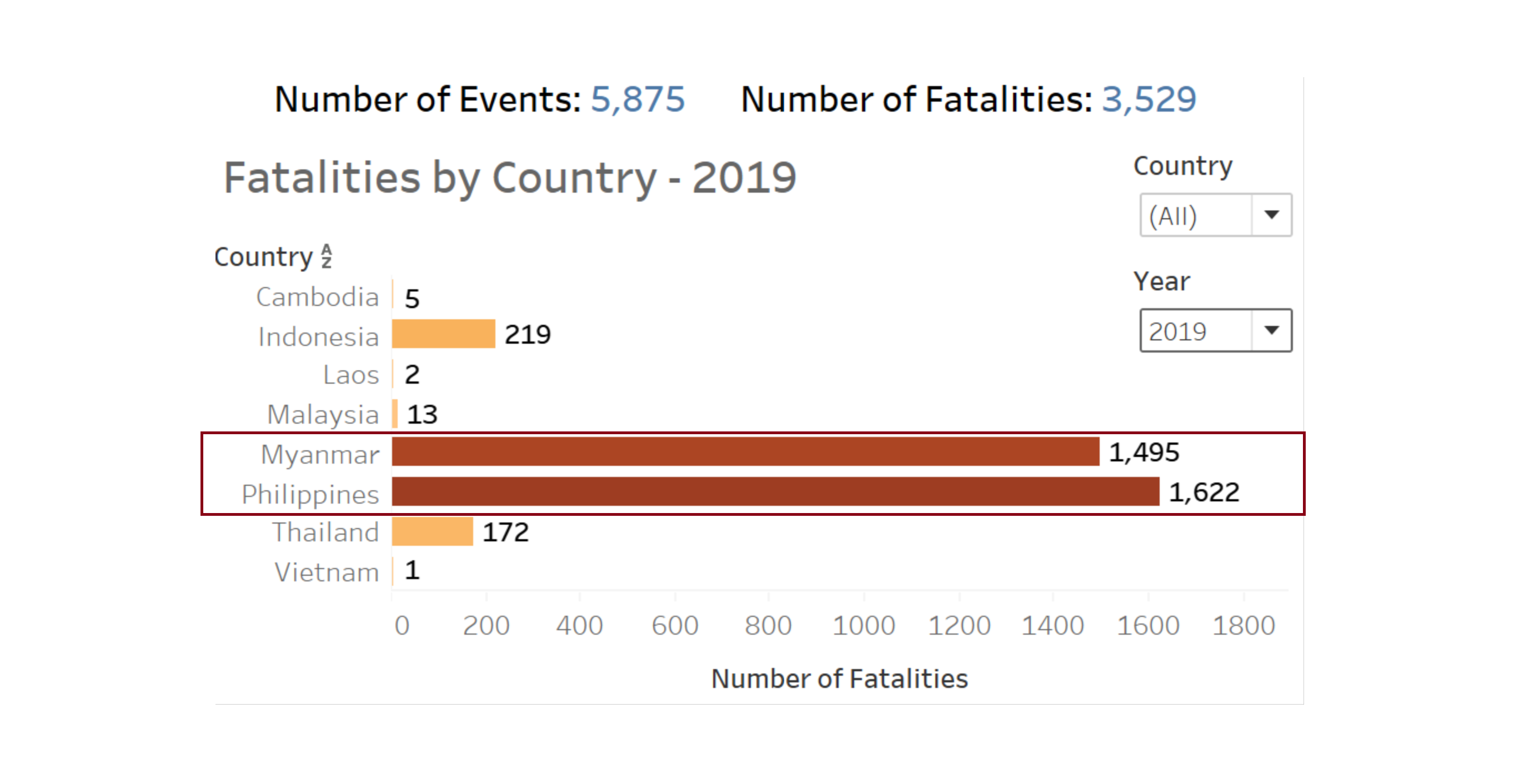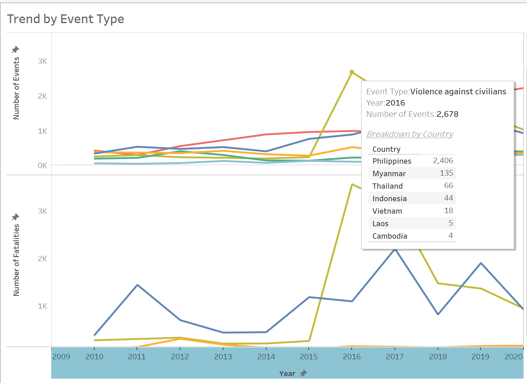 In order to build a dashboard that is interactive, parameter actions such as filters are used. For instance, user can visualize the number of events occurring in a country using a parameter control to change the year in which the event took place.