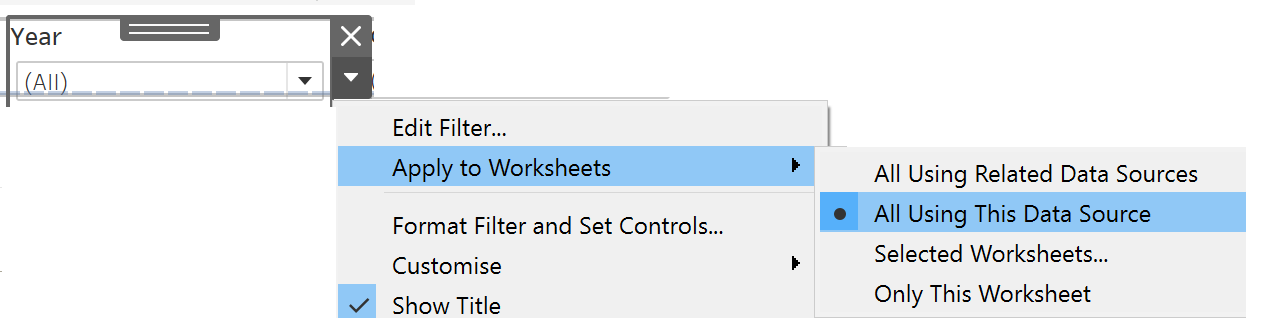 Select every filter on the right pane and click on the left arrow indicating “More Options”. Select “Apply to Worksheets” and click on “All Using This Data Source”.