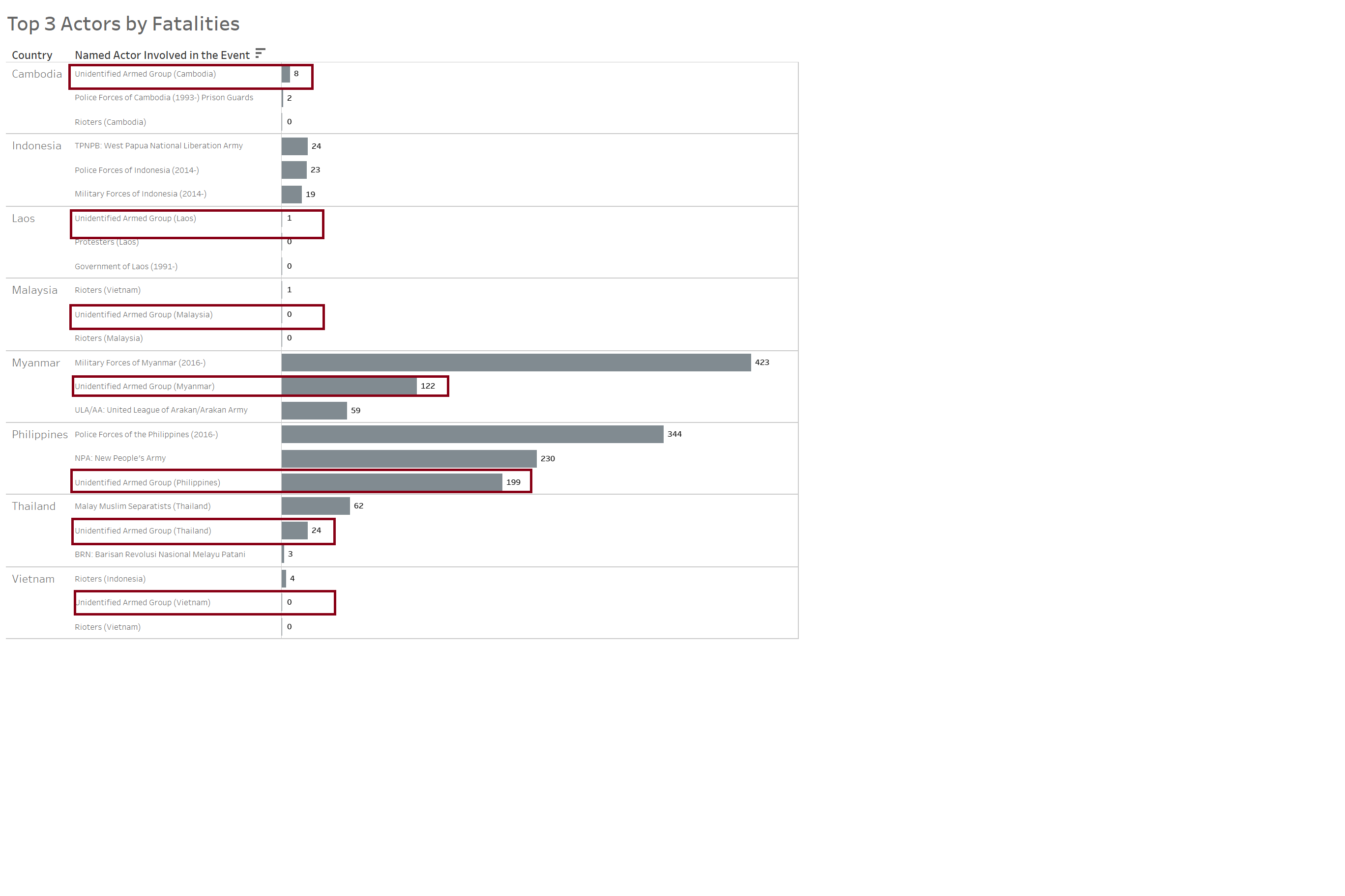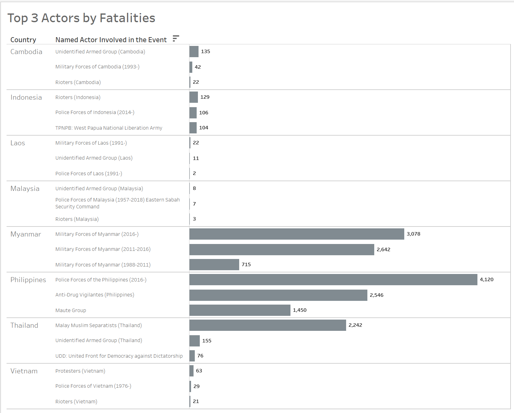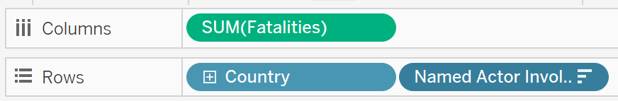 In the Data pane, drag [Fatalities] to the Columns shelf and [Country] and [Named Actor Involved in the Event] to the Rows shelf.