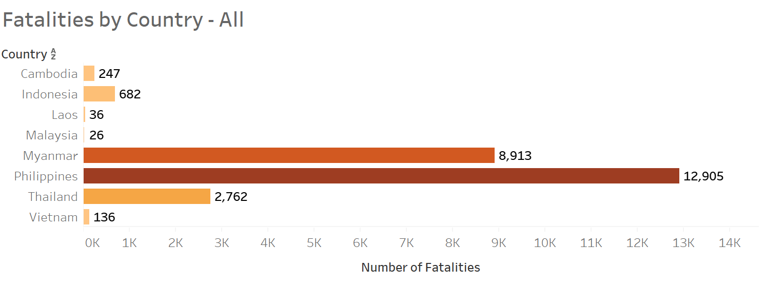 Next, number of fatalities were highlighted in Bar charts as opposed to proportional symbol maps as it can be difficult to distinguish between different shades due to vast amount of data values.