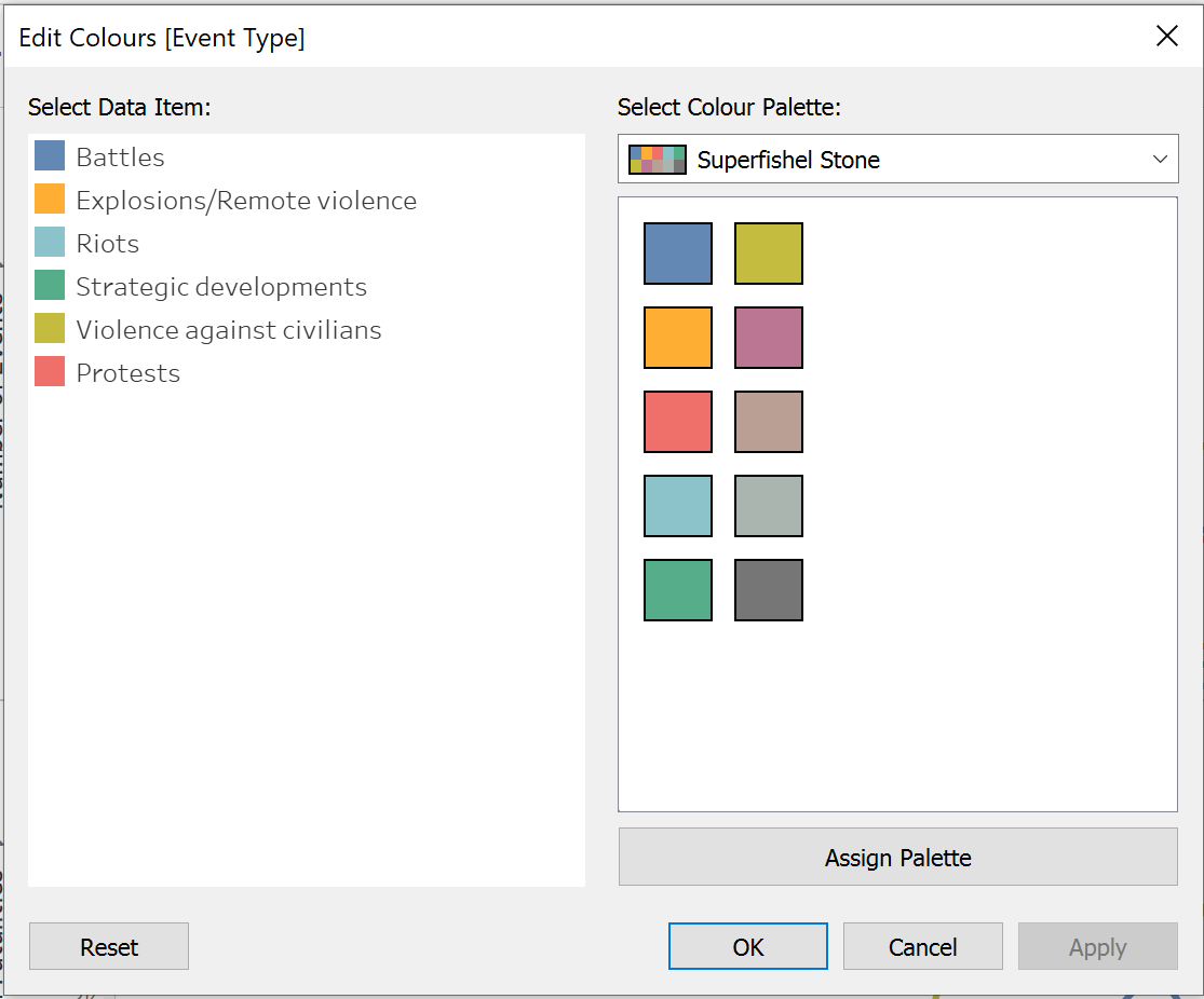 Drag [Event Type] onto Colour on the Marks card and edit the Colour as follows: