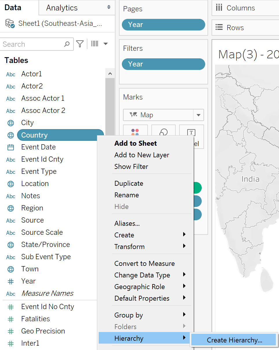 In the Data pane, click on [Country] and select Hierarchy > Create Hierarchy.