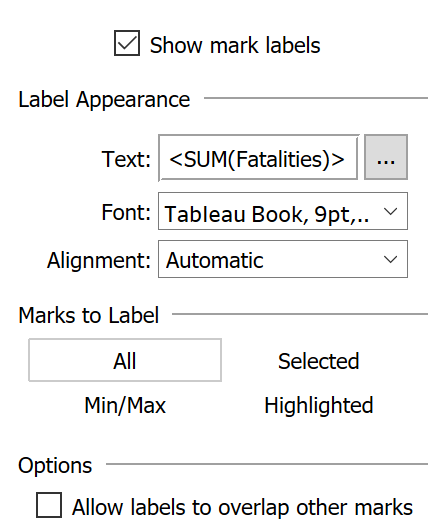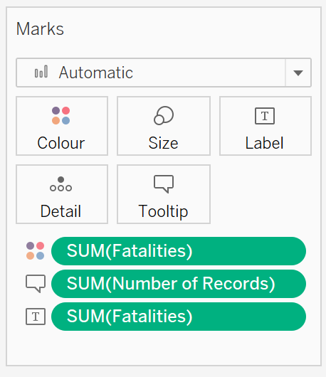 Drag [Fatalities] onto Colour and Label, and [Number of Records] onto Detail on the Marks card.