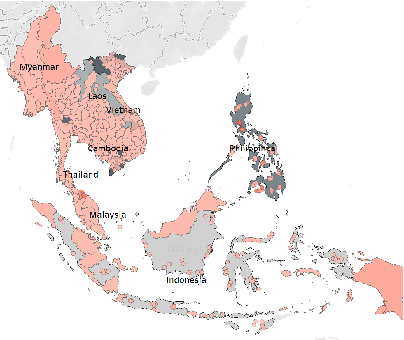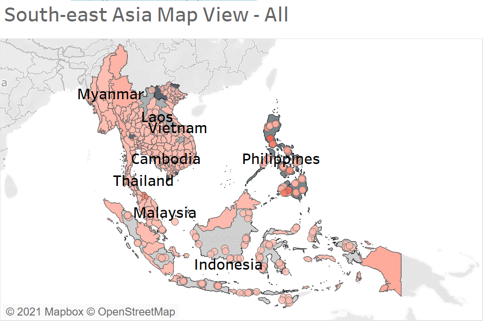 Philippines is the country with regions covered in darker Red as compared to other South-east Asia countries.