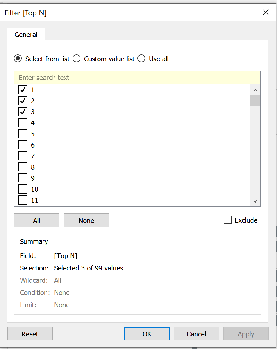 In the Filter dialog box, select the range of values for your Top N as follows, then click Ok.