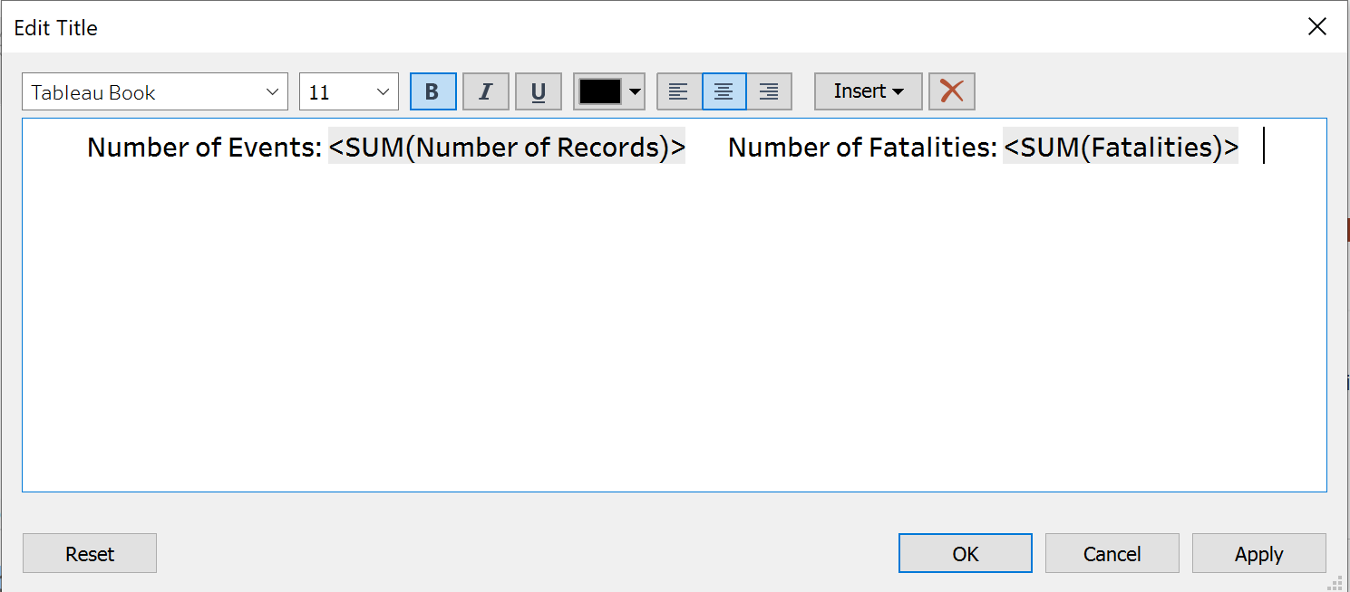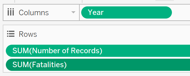 In the Data pane, drag [Year] to the Columns shelf and [Number of Records] and [Fatalities] to the Rows shelf.