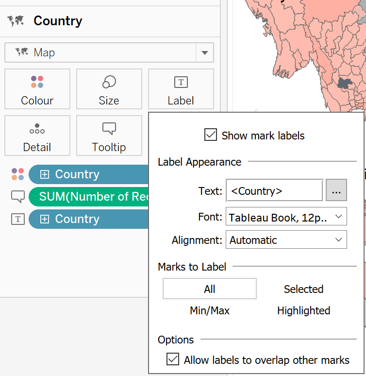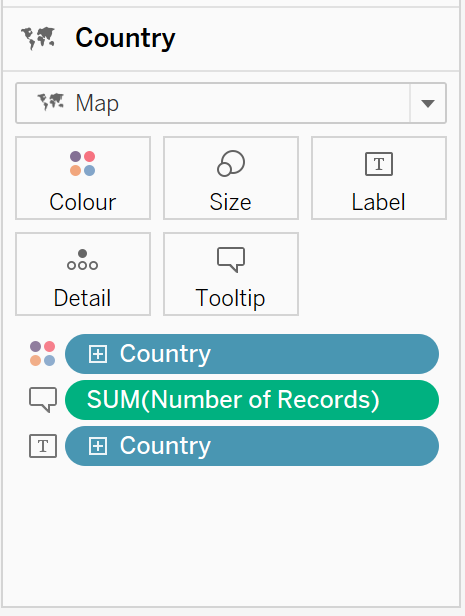 Drop [Country] on the Add a Marks Layer control displays in the top left corner of the view. A new marks layer is added to the Marks card. Drag [Country] onto Colour and Label, and [Number of Records] onto Tooltip on the Marks card.