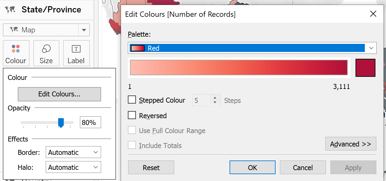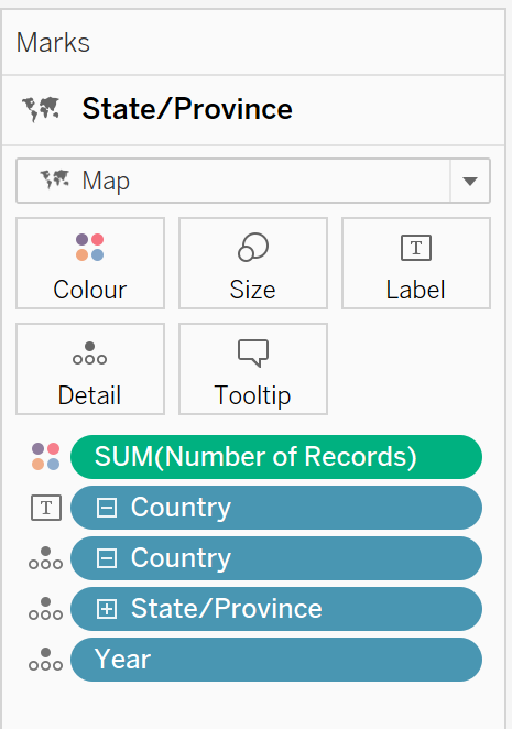 Drag [Country] onto Label on the Marks card. Drag [Country], [State/Province] and [Year] onto Detail on the Marks card. Drag [Number of Records] onto Colour on the Marks card.