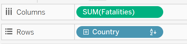 In the Data pane, drag [Fatalities] to the Columns shelf and [Country] to the Rows shelf.