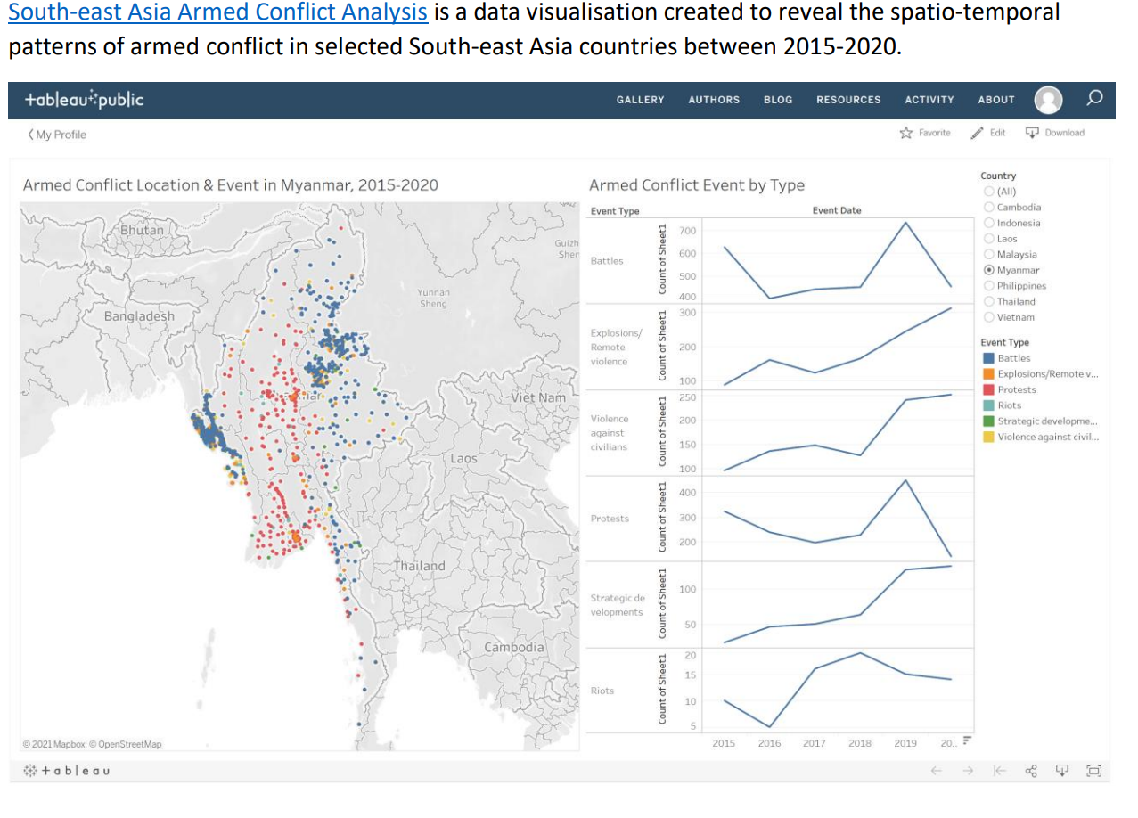 The first map on “Armed Conflict Location & Event in Myanmar, 2015-2020” does not clearly show the country names in the data due to the opacity of the overlapping/overcrowding data points.