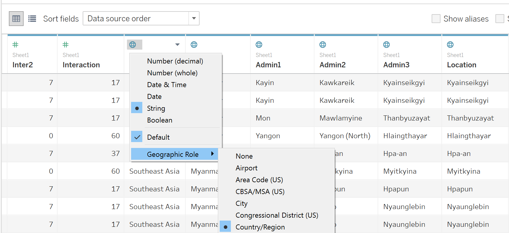On the Data Source page, click the data type icon for [Region] and select Geographic Role: Country/Region. Click the data type icon for [Admin1] and select Geographic Role: State/Province. Click on the data type icon for [Admin2], [Admin3] and [Location] and select Geographic Role: City.
