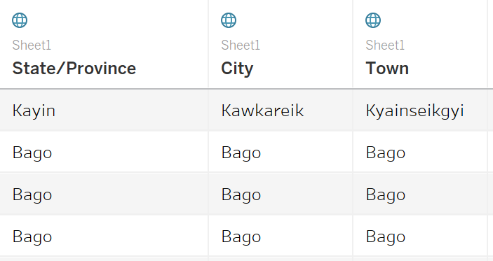 Double click the name of columns; [Admin1], [Admin2] and [Admin3] to rename the field to State/Province, City and Town respectively.