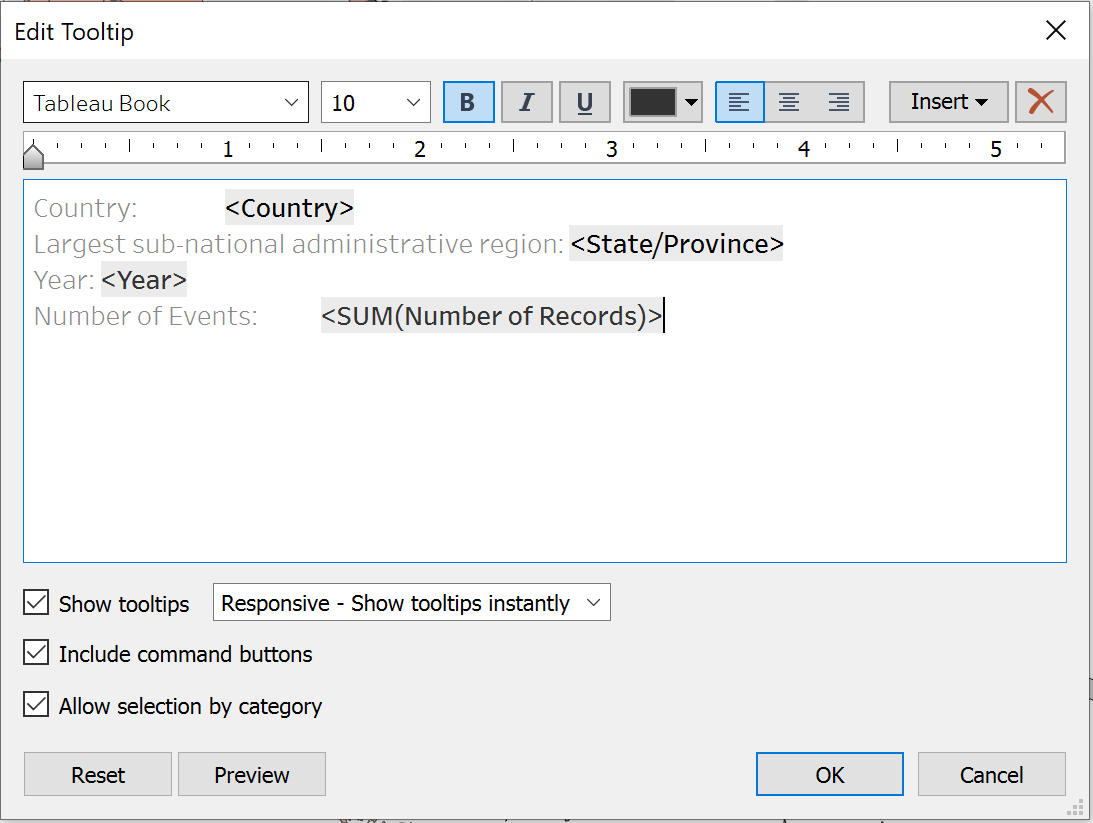 On the Marks card, select Tooltip and edit to display the following information.Rename State/Province to Largest sub-national administrative region.