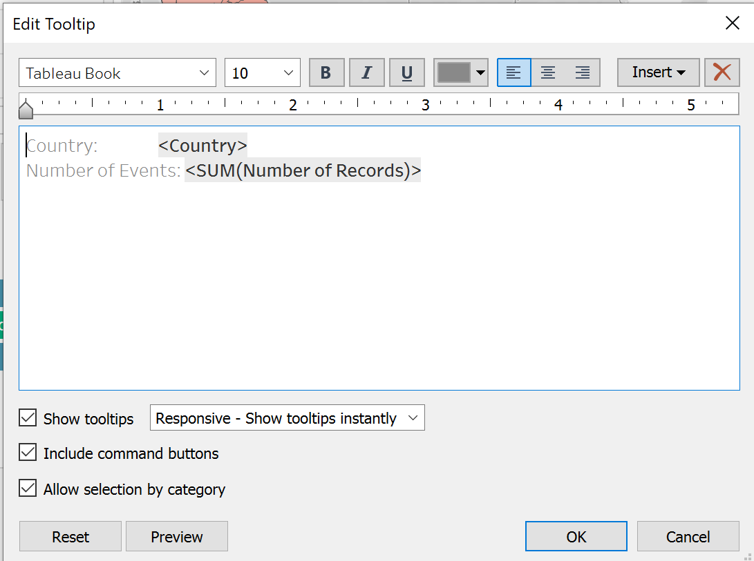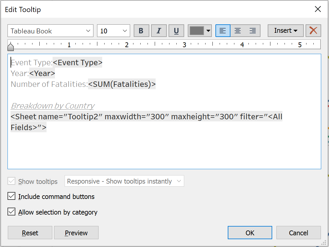 In the source worksheet, click Tooltip in the Marks card. In the Tooltip Editor, insert a reference to the Viz in Tooltip target worksheet as follows: