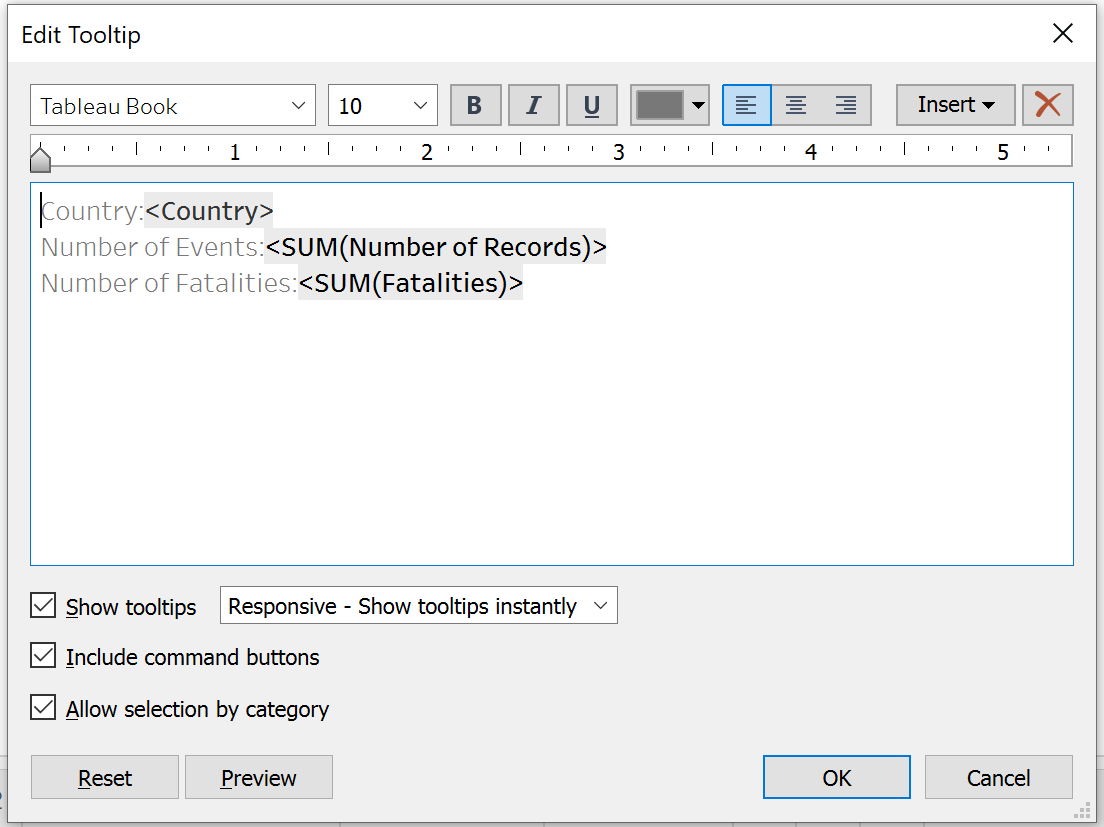 Create views in Tooltips to display the breakdown of number of events and number of fatalities by Country.