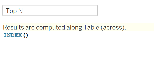 Name the calculation as Top N and enter the following formula, then click Ok.